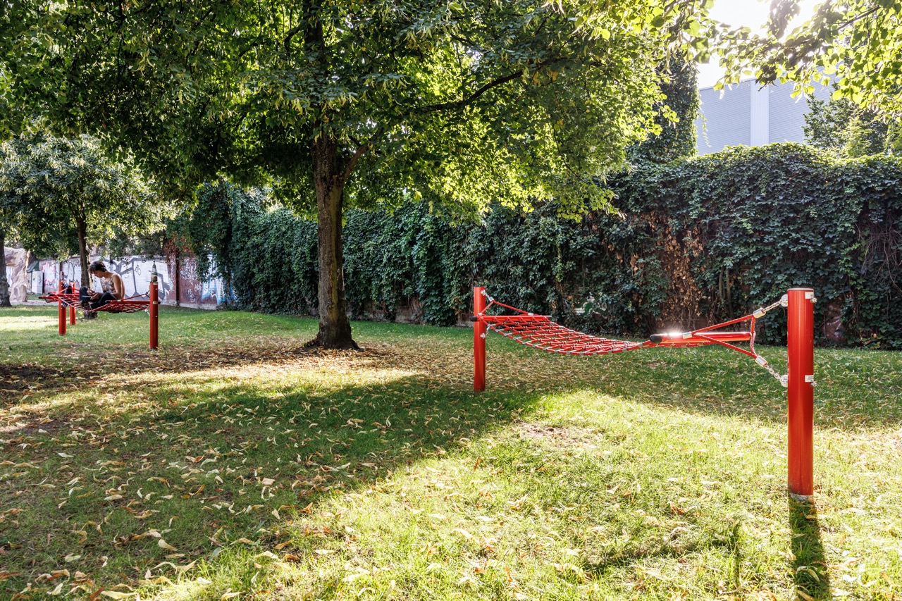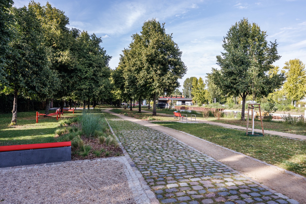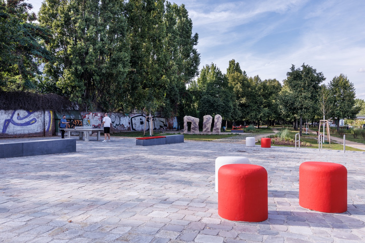 In den anschließenden Grünbereichen laden ein Boulderfelsen, Tischtennisplatten, Slacklines, Hängematten und eine kleine Veranstaltungsfläche im Baumhain zu Bewegung, Spiel und Begegnung ein. Neue Aufenthaltsmöglichkeiten am Wasser, Pflanzinseln mit Wildstauden, extensive Begrünungen und Kletterpflanzen an der Mauer schaffen zugleich eine naturnahe Atmosphäre und stärken die ökologische Vielfalt.