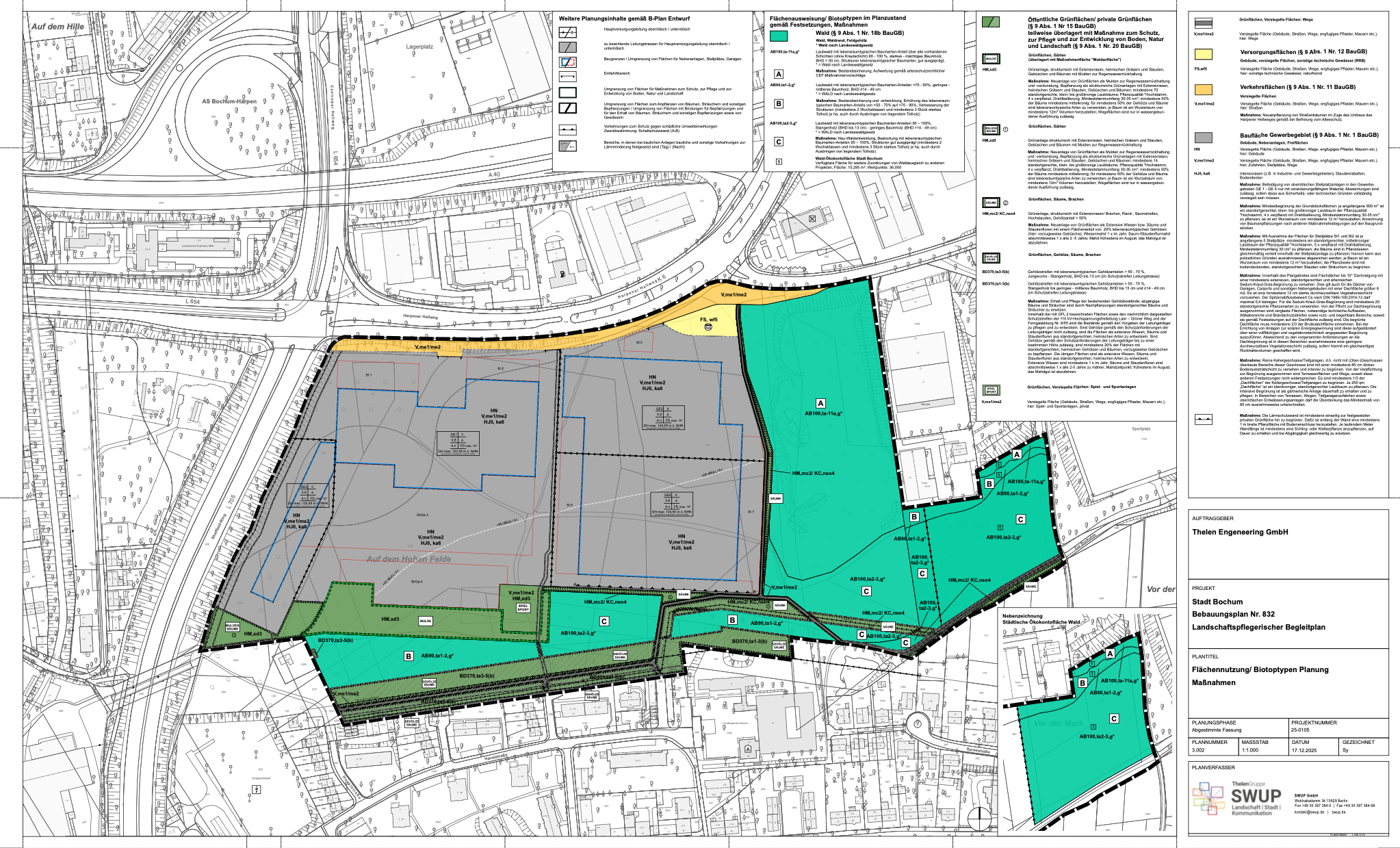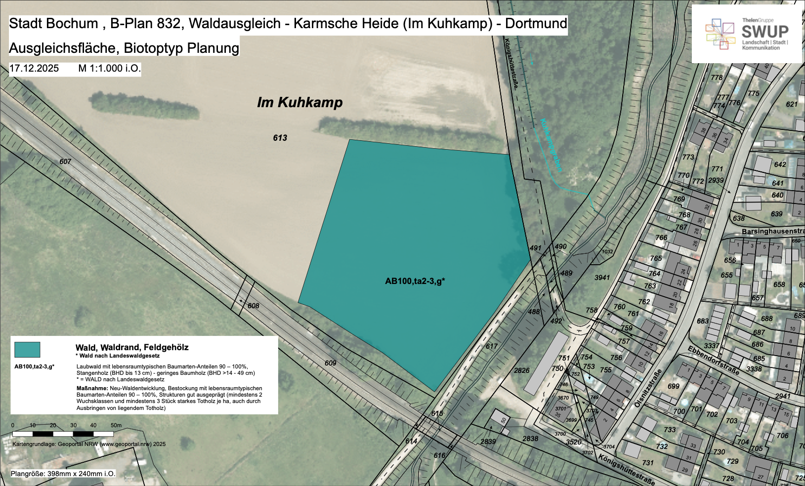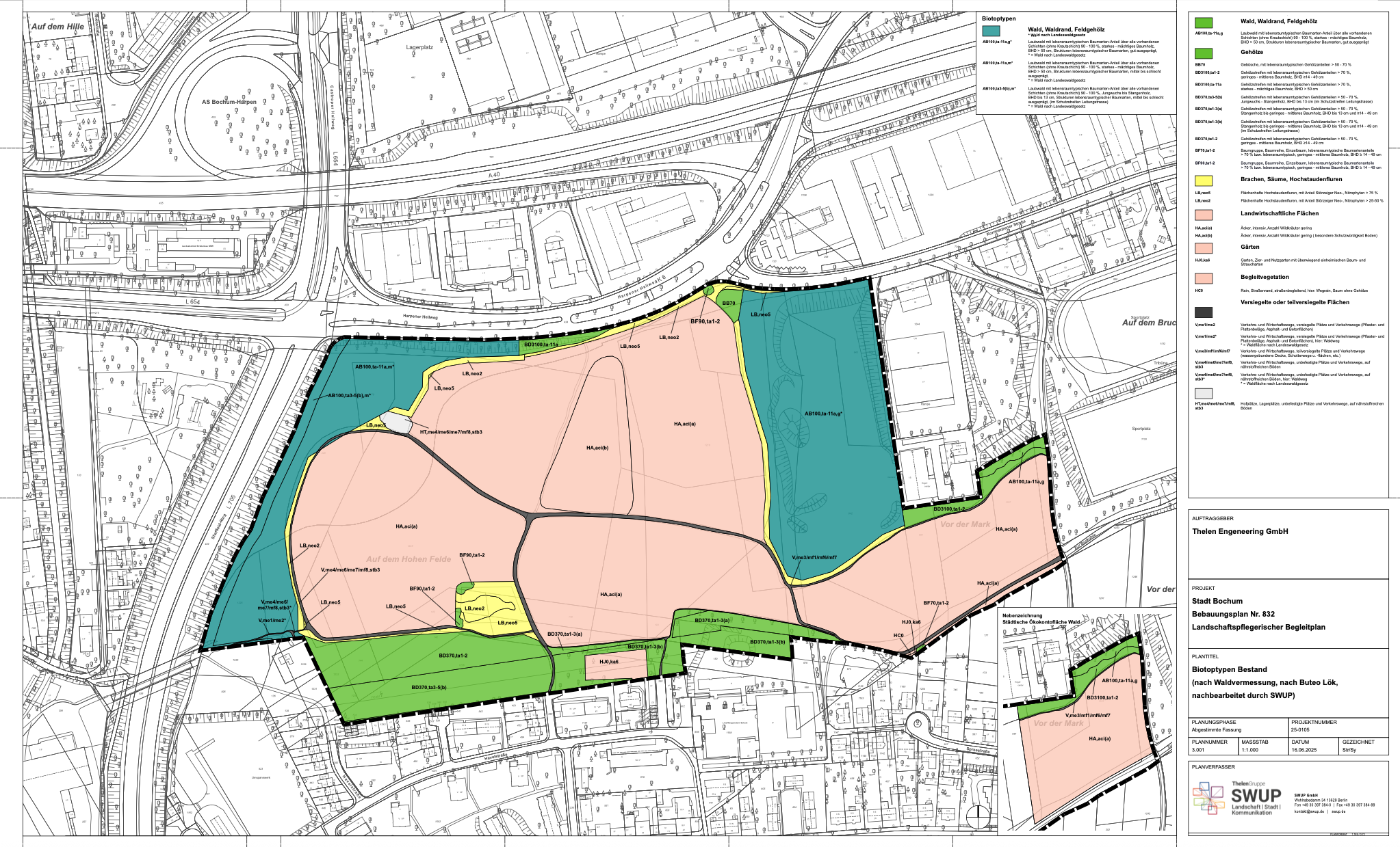 In der Sitzung am 19.03.2026 hat der Rat der Stadt Bochum den Bebauungsplan Nr. 832 als Satzung beschlossen. Damit sind nun die planungsrechtlichen Voraussetzungen für die Errichtung des neuen Polizeipräsidiums Bochum geschaffen. SWUP hat das Verfahren mit der Erstellung des Landschaftspflegerischen Begleitplans und des Umweltberichts unterstützt. Zu den Herausforderungen gehörte die Zusammenstellung umfangreicher externer Ausgleichsmaßnahmen für den Waldausgleich und den naturschutzrechtlichen Ausgleich.