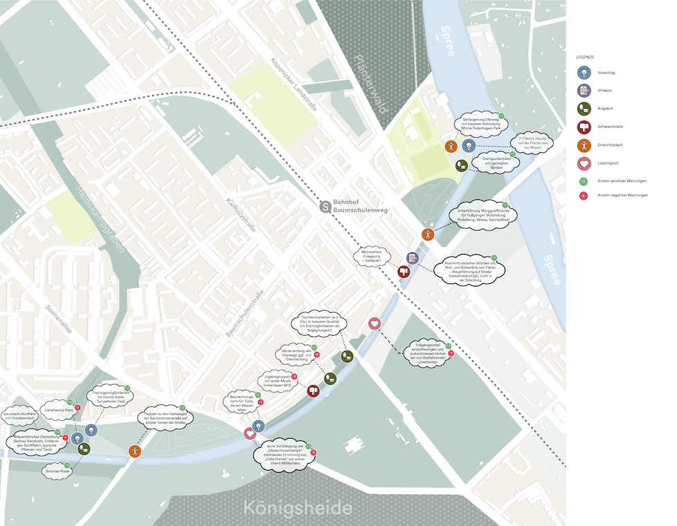 Der Erarbeitungsprozess war geprägt von enger Zusammenarbeit zwischen Bezirk, Senatsverwaltungen, Wasserstraßen- und Schifffahrtsamt, Fachbehörden, Kleingartenvertretungen sowie weiteren Akteur*innen. Neben verwaltungsinternen Workshops und Fachgesprächen wurden auch Beteiligungsformate für die Öffentlichkeit durchgeführt. Die Rückmeldungen aus der Bürgerschaft – insbesondere der Wunsch nach besserer Vernetzung bei gleichzeitigem Erhalt von Naturflächen – sind in die Bewertung der Maßnahmen eingeflossen.