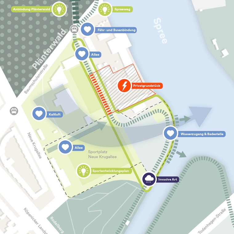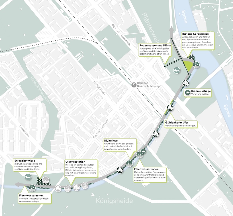 Im Mittelpunkt steht die langfristige Qualifizierung des nördlichen Uferbereichs zwischen Heidekampgraben und Spree. Ziel ist es, neue Erholungsräume zu erschließen, bestehende Grün- und Freiflächen besser miteinander zu vernetzen und die Zugänglichkeit zum Wasser behutsam zu verbessern – im Einklang mit Natur- und Artenschutz sowie den Anforderungen der Bundeswasserstraße.