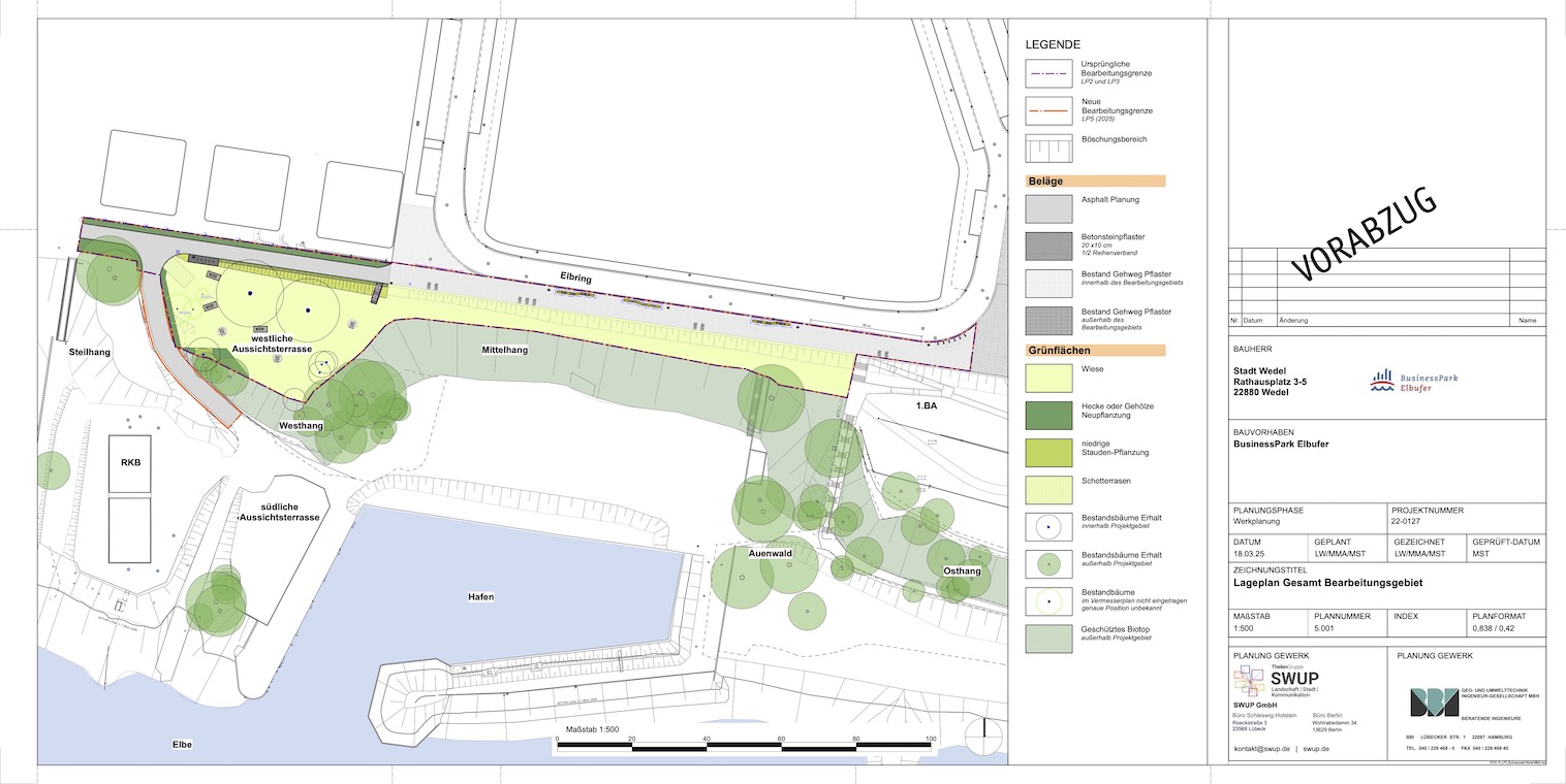 Am 20.10.2025 fand die Bauanlaufberatung zu den Freianlagen im Buisnesspark Wedel statt. Die Rodungs- und Mahdarbeiten sollen noch in diesem Jahr stattfinden, bautechnischer Beginn ist jedoch erst an Anfang 2026. SWUP hat die Freianlagen in den Leistungsphase 1-7 geplant und führt nun die Bauüberwachung durch.